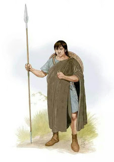 Llevaban capas negras y ásperas, de una lana parecida a la de las cabras salvajes. Se armaban con escudos galos, otros, en cambio, llevan grandes escudos redondos del tamaño del aspis griego.