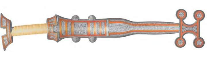 En sus piernas y espinillas trenzaban bandas de pelo, y cubren sus cabezas con cascos de bronce adornados con crestas de color escarlata. Usan también espadas de dos filos, forjadas con excelente hierro, y puñales de un palmo de longitud, de los cuales se sirven en los combates cuerpo a cuerpo. Combatían a pie y a caballo.